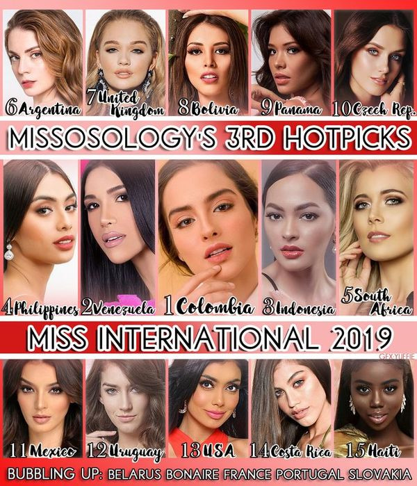 Mới đây, chuyên trang Missosology đã bắt đầu đưa ra bảng xếp hạng những gương mặt sáng giá của cuộc thi Hoa hậu Quốc tế 2019. Theo đó, lọt vào top 15 đều là những thí sinh có tiềm năng lớn, sở hữu nhan sắc xinh đẹp và profile cực ấn tượng mà Ấ hậu Tường San sẽ phải dè chừng.