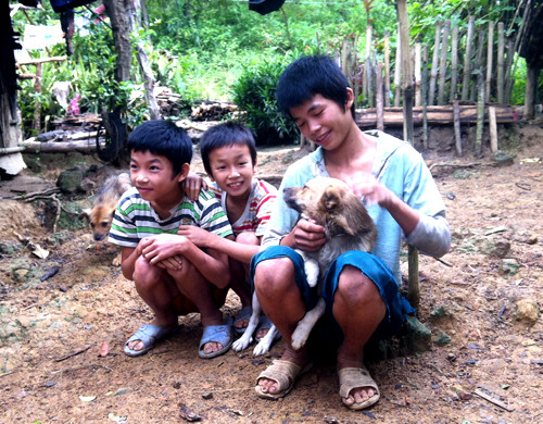 “Các con lại đây với mọi người, không ai làm gì các con đâu”, thấy con quá rụt rè, người bố phải gọi nhiều lần đám trẻ mới chịu bám vào nhau nhích từng bước một về phía người lạ. A Dưởng cho biết chúng đều biết nói tiếng Kinh nhưng trước những câu hỏi của khách, hầu như bọn trẻ chỉ biết cười hoặc trả lời “có” hoặc “không”.
