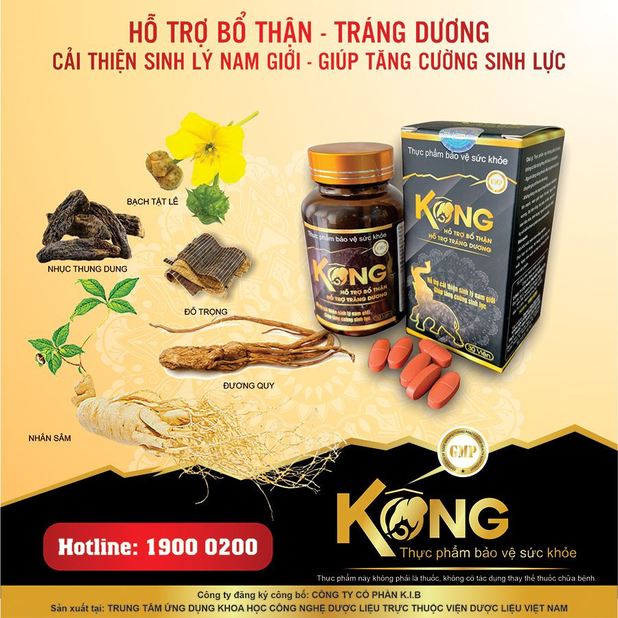 Trên thị trường, có rất nhiều sản phẩm giúp hỗ trợ tăng cường sinh lý nam. Trong đó sản phẩm KÔNG chứa tất cả các thành phần trên, giúp hỗ trợ nam giới cải thiện sinh lý. KÔNG là sản phẩm được sản xuất tại Trung tâm Ứng dụng Khoa học Công nghệ Dược liệu, trực thuộc Viện Dược liệu Việt Nam, được nhiều quý ông tin dùng.