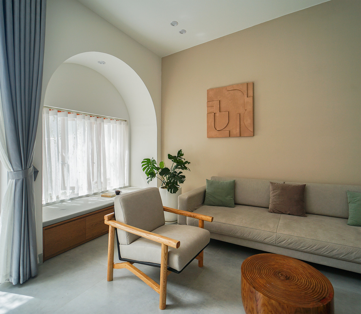 Vật liệu chính được sử dụng là bê tông, gỗ sồi. Màu sắc chủ đạo là màu be - xám nhấn nhá màu cam của gỗ và tranh treo tường cho không gian có sự đồng điệu từ trong ra ngoài.