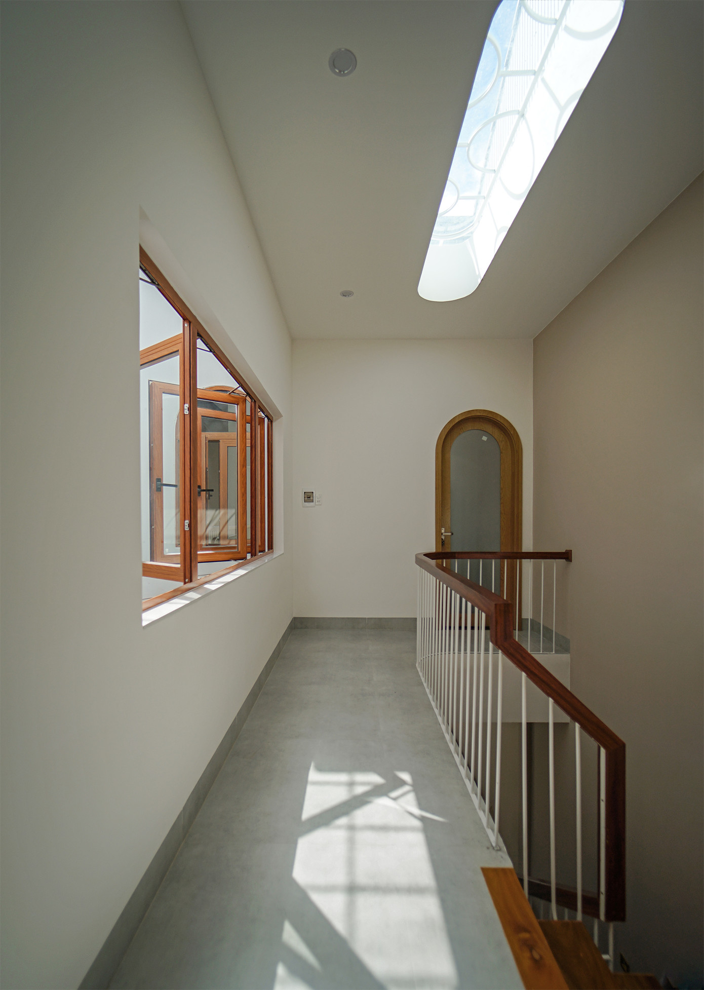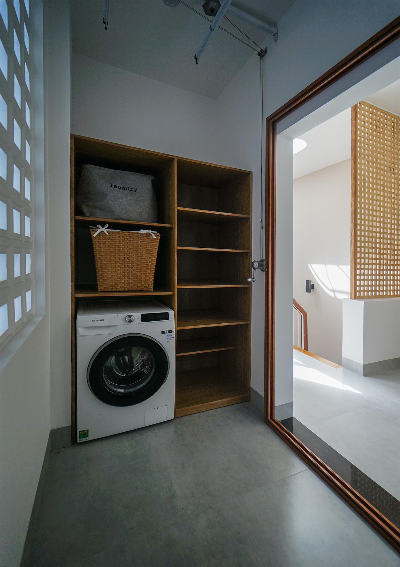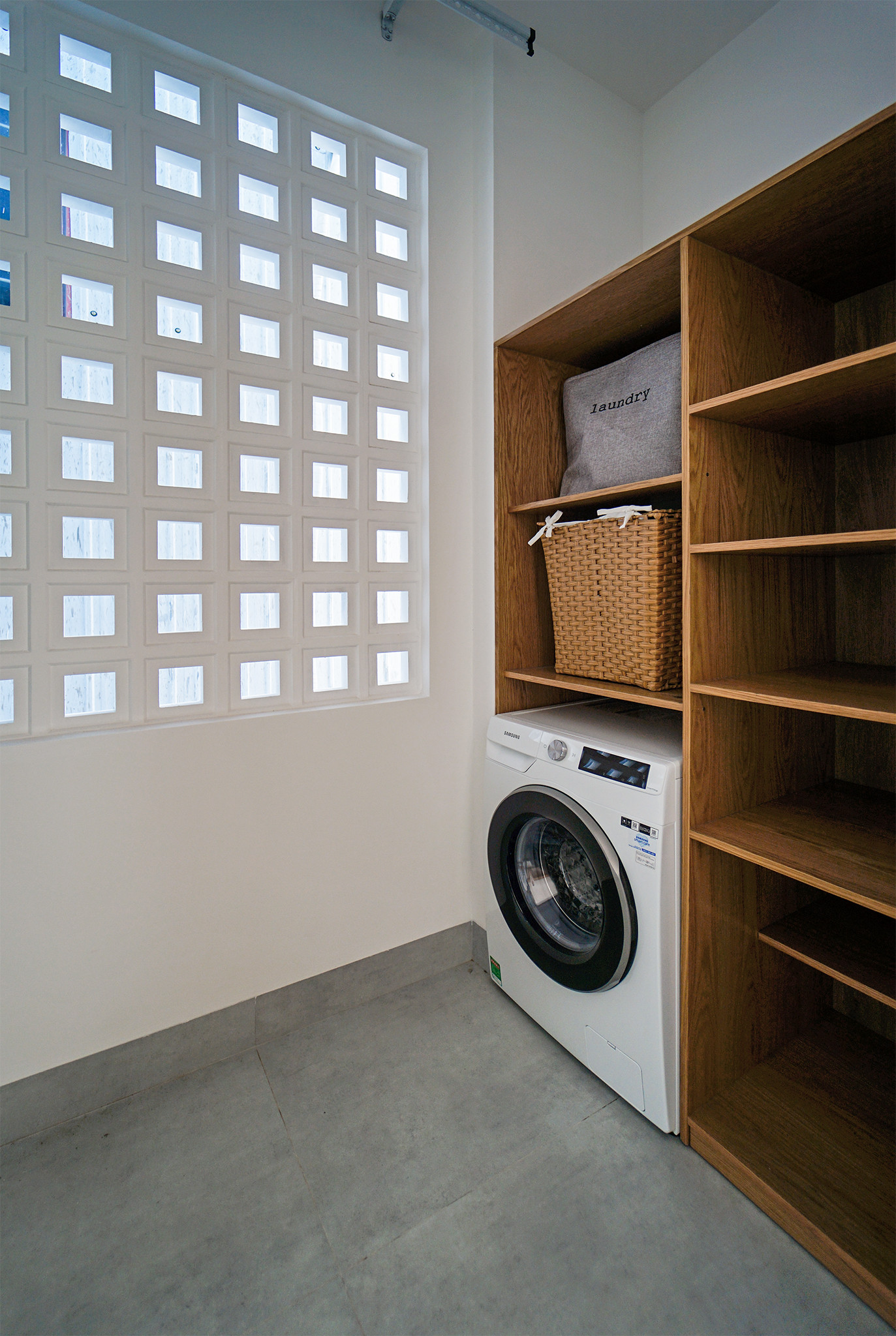 Khu vực hành lang và khu giặt ủi được thêm thắt các lưới lấy sáng như ô gió và cửa sổ để không khí được lưu thông, nâng cao chất lượng không khí trong nhà.