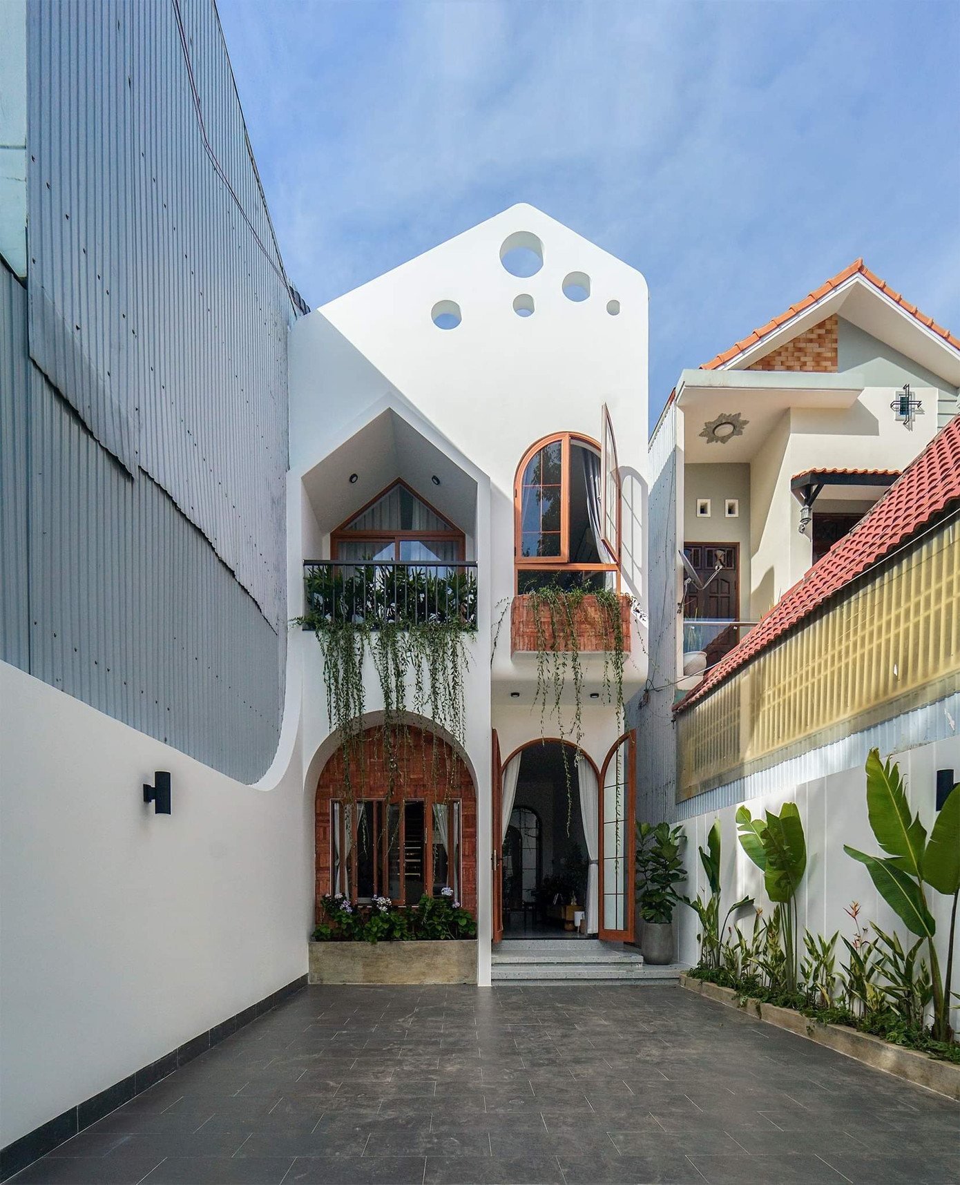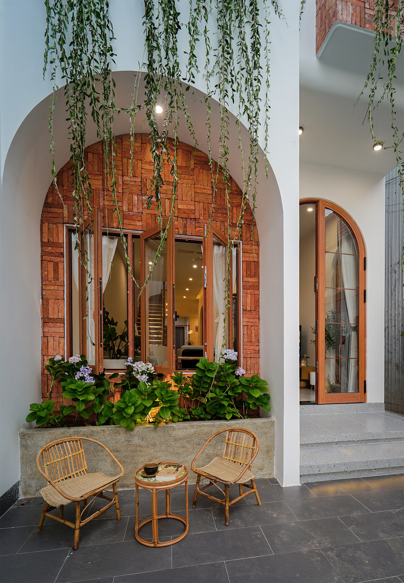 Mặt tiền ngôi nhà khá ấn tượng với sự pha trộn giữa gạch thẻ thô mộc, đá mài, màu sơn trắng kết hợp với dàn cây xanh phủ xanh mặt tiền.