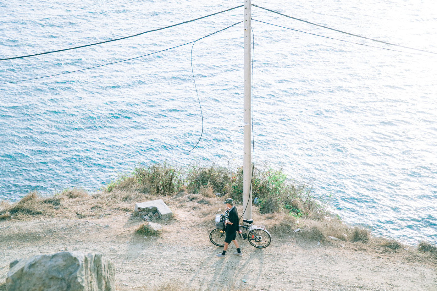 Một góc bình yên của con đường dẫn ra Bãi Sau - Ảnh: Nguyễn Thế Bảo Dắt xe hoặc đi bộ trên triền núi, bạn sẽ bị choáng ngợp bởi cảnh sắc thường thấy trong các thước phim điện ảnh. Sắc xanh biếc của bầu trời đổ xuống mặt biển mênh mông. Một bên là biển rộng, một bên là núi cao. Sau lưng là con đường mòn nhỏ, trước mặt là những con dốc thoai thoải phủ đầy màu xanh của cỏ cây, hoa lá.