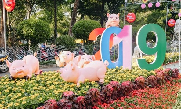 Lối đi vào đường hoa Xuân tràn ngập biểu tượng heo