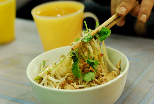 Đây chính là "ngôi sao" của phố Hàng Hòm. Những sợi phở trắng bóng ánh lên vẻ dầy dặn, hấp dẫn. Thịt gà, thịt bò lựa chọn khéo léo nên ngọt và mềm tự nhiên. Các thành phần phụ như rau sống, lạc rang, dưa chuột giúp món ăn thêm lạ miệng. Đặc biệt, xì dầu cho thêm vừa vặn nên món này không bị khét hay quá mặn.