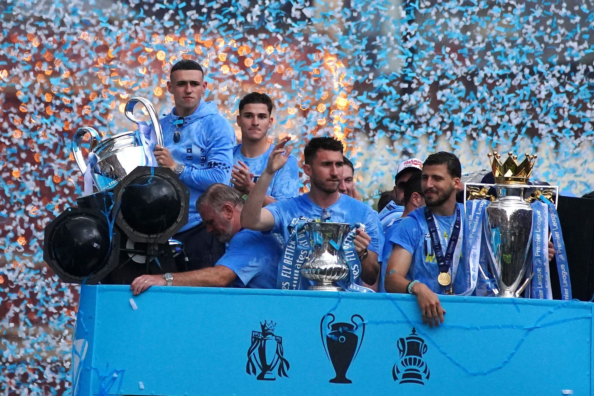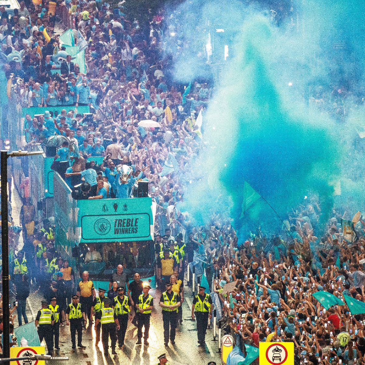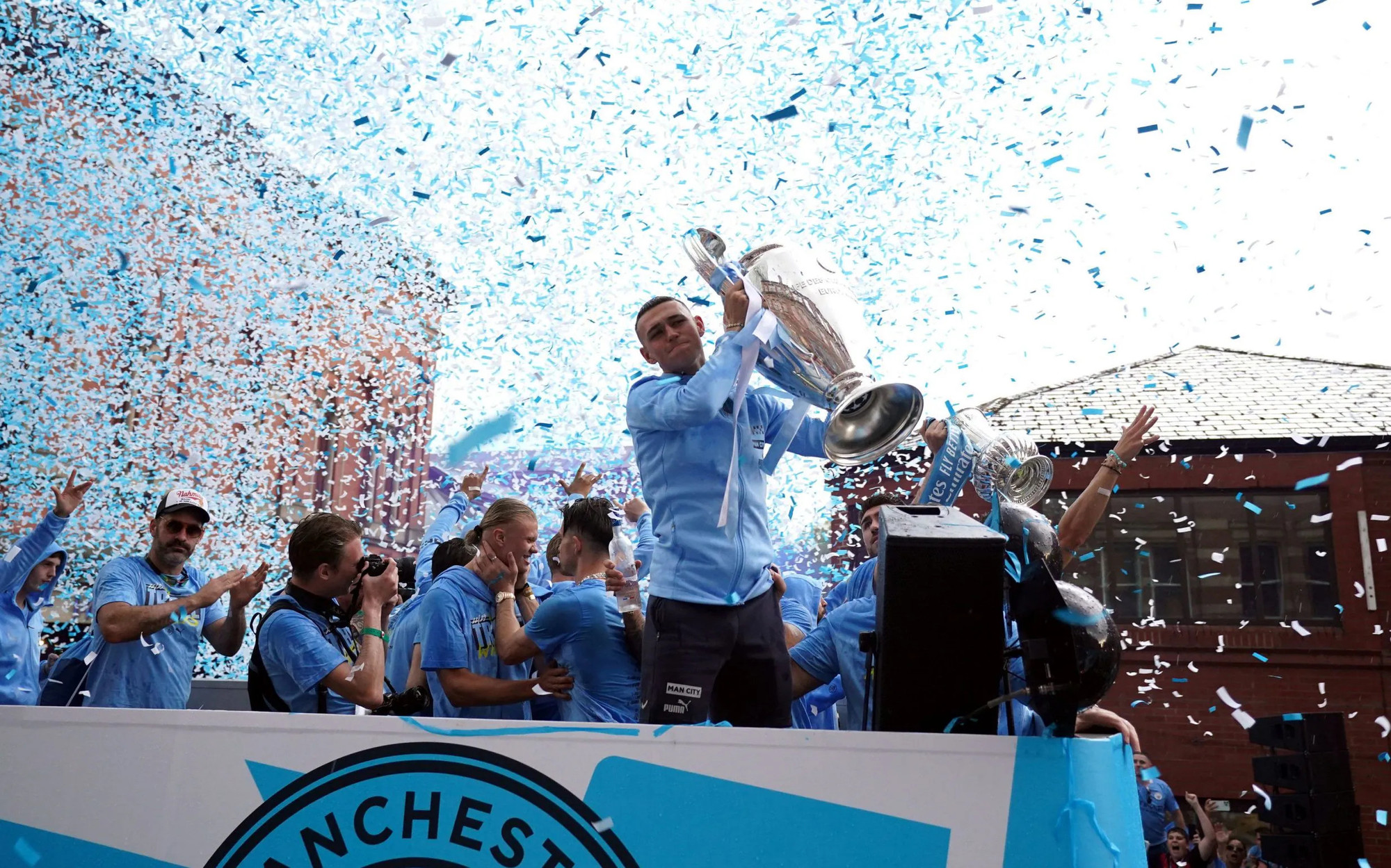 Nhiều thành viên Man City như Ake, Dias hay Haaland đã cởi trần để tắm mưa, ăn mừng cùng NHM. Tất cả cùng hát vang và nhảy múa. HLV Pep Guardiola cười tươi, cùng ê kíp huấn luyện cổ vũ các cầu thủ ăn mừng.