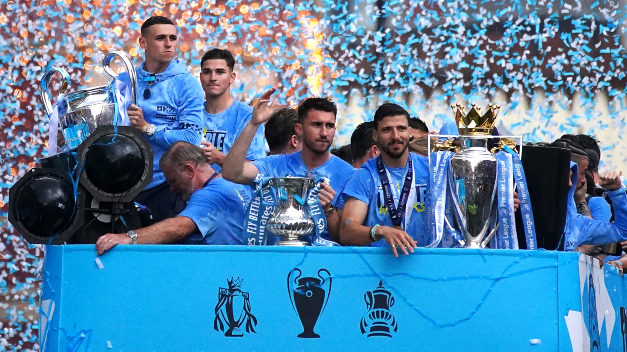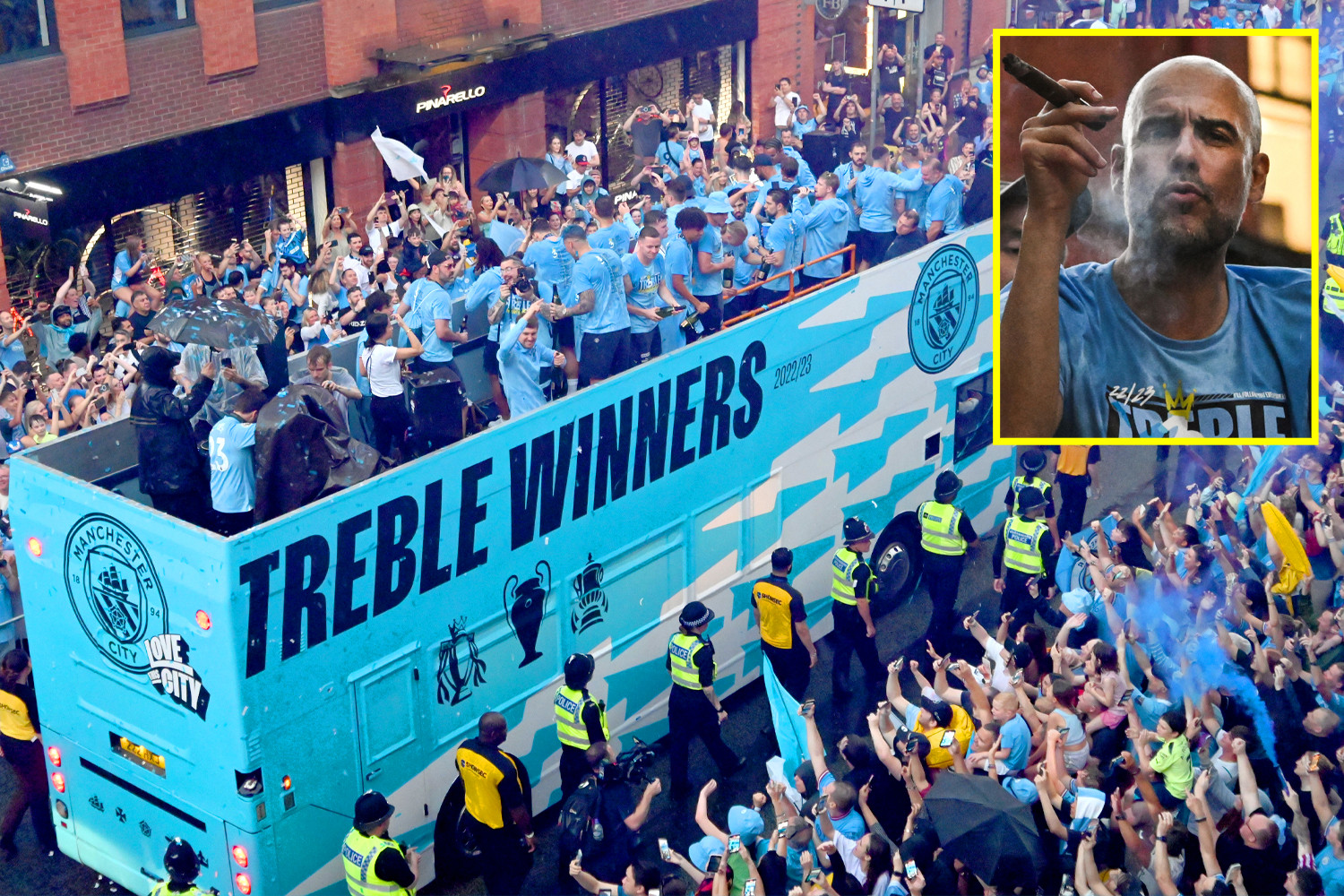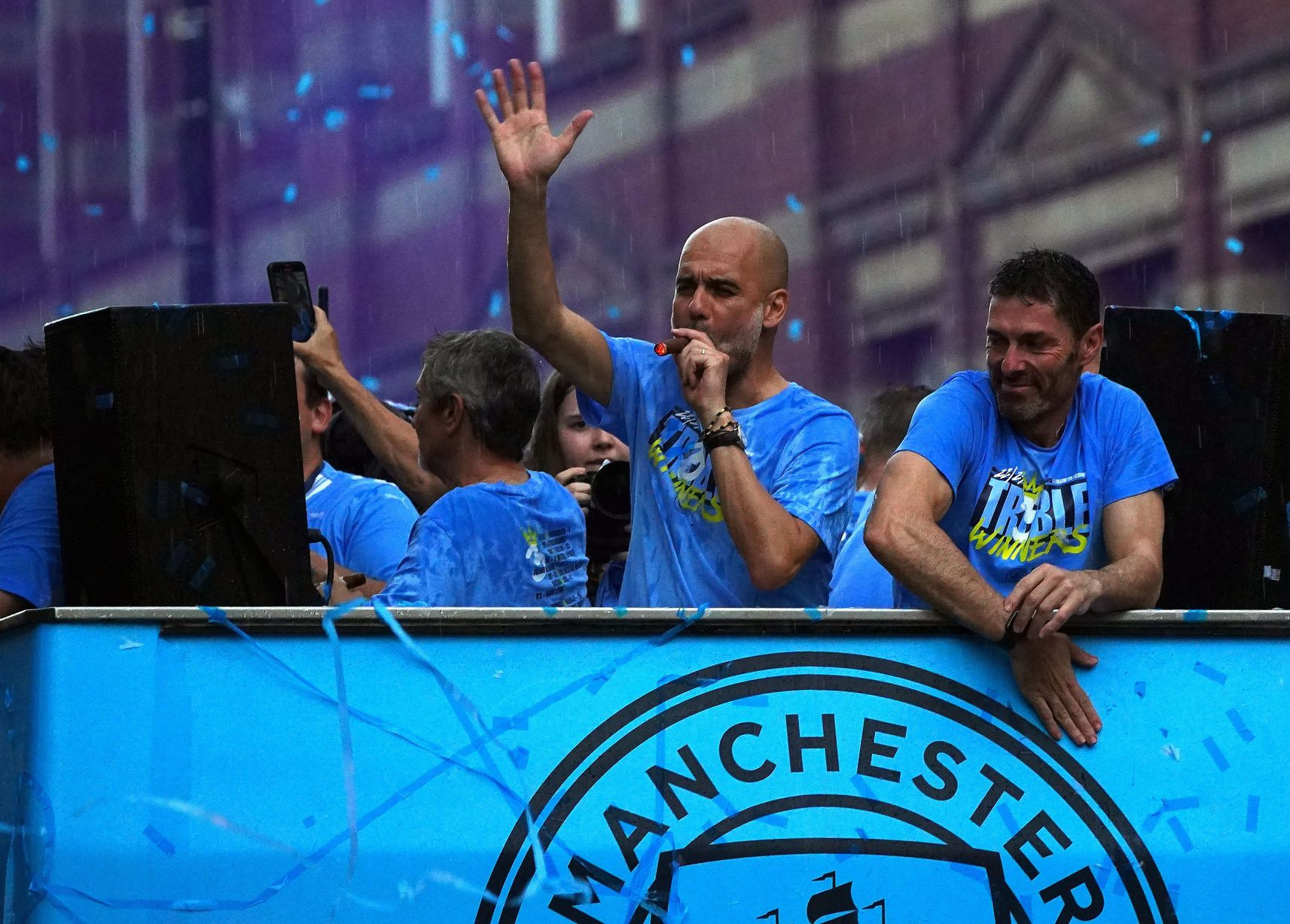 Nhiều thành viên Man City như Ake, Dias hay Haaland đã cởi trần để tắm mưa, ăn mừng cùng NHM. Tất cả cùng hát vang và nhảy múa. HLV Pep Guardiola cười tươi, cùng ê kíp huấn luyện cổ vũ các cầu thủ ăn mừng.