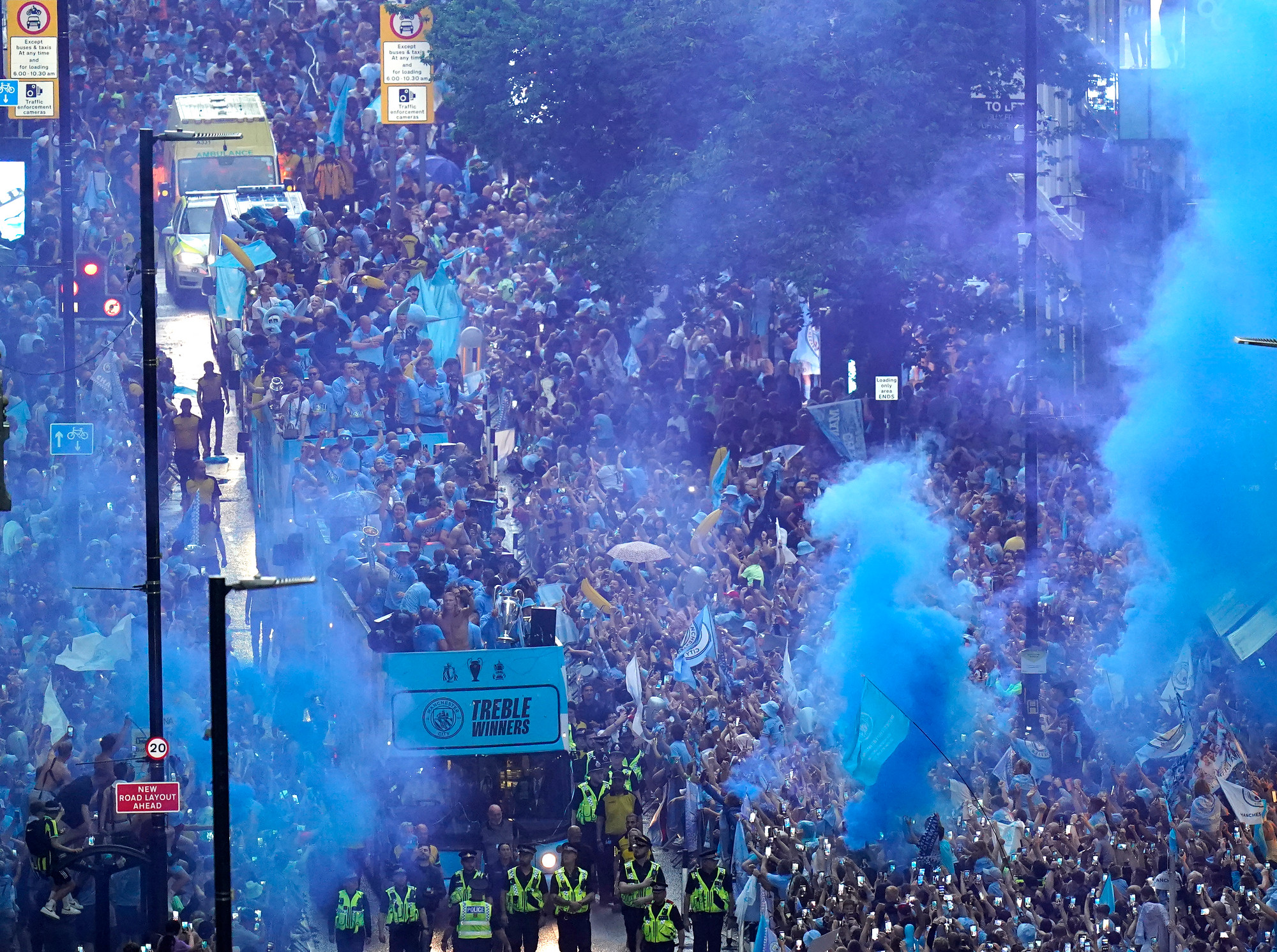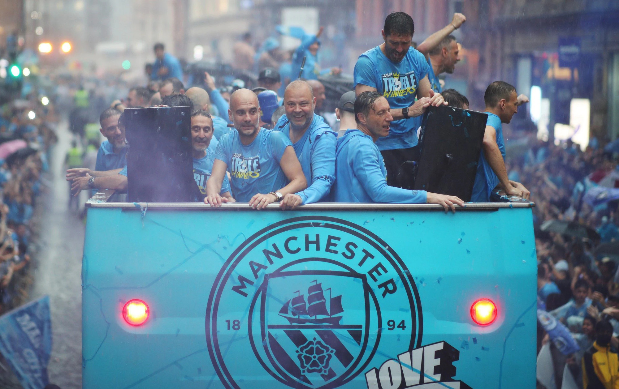 Toàn đội đi giữa biển người hâm mộ. Dự kiến có khoảng 100 ngàn người đã ùa ra đường để chứng kiến lễ đăng quang lịch sử của đội nhà, sau khi thầy trò Pep Guardiola giành FA Cup, Ngoại hạng Anh và Cúp C1 châu Âu.