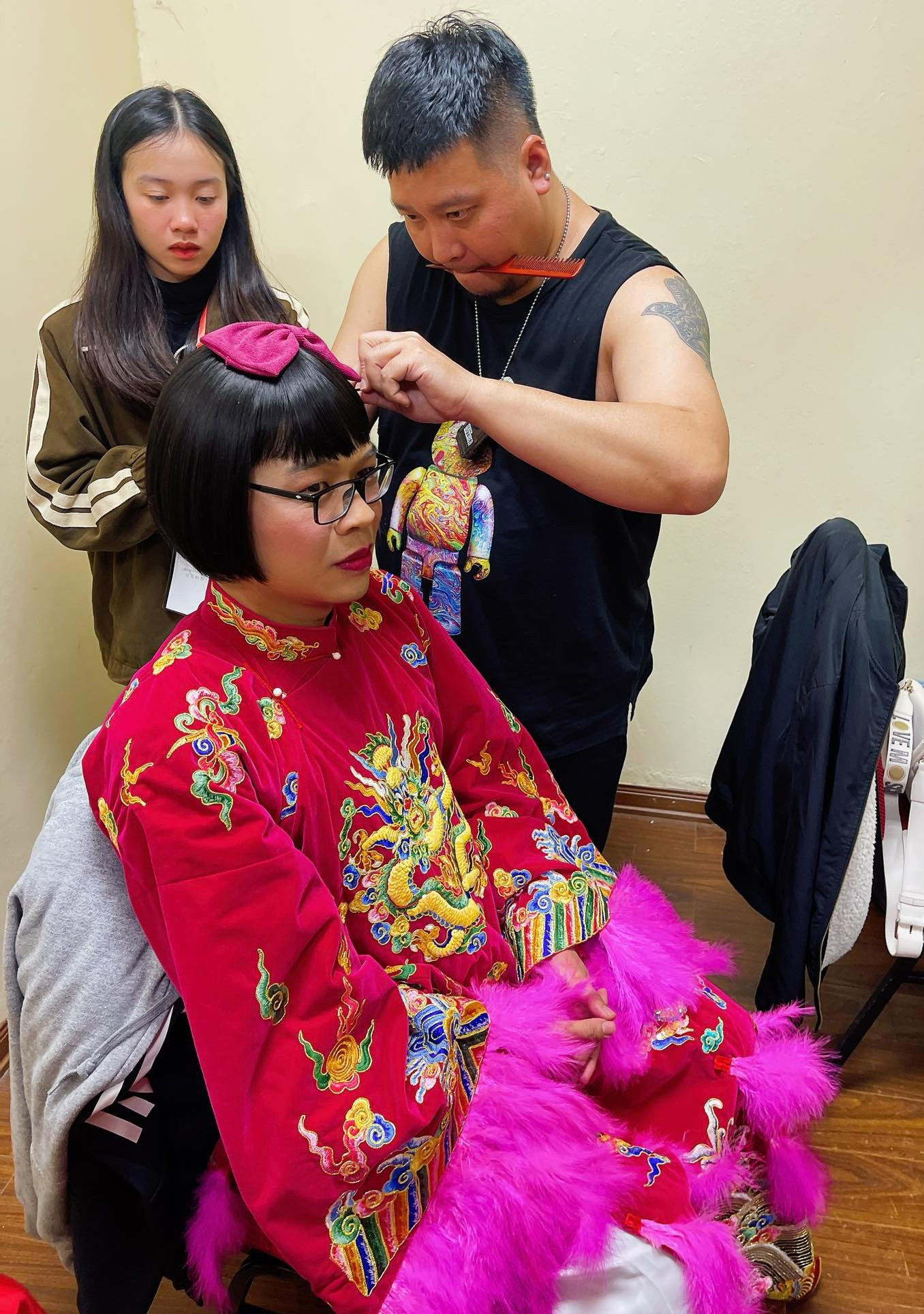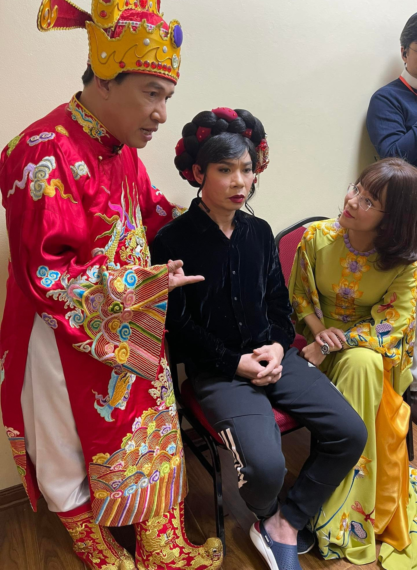 | NSND Công Lý và vợ tại buổi tổng duyệt. |