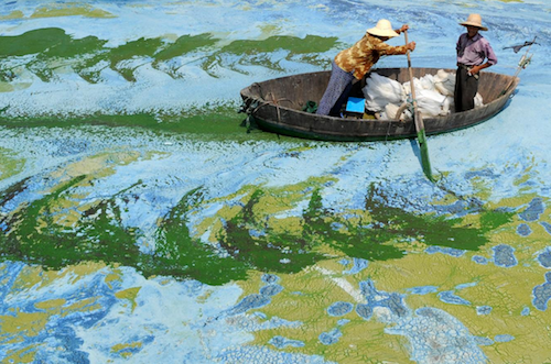 Hai người dân khổ sở chèo thuyền giữa đám tảo ở Sào Hồ (Trung Quốc) năm 2009.