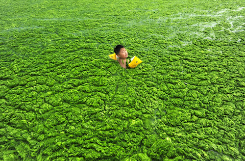 Một cậu bé bơi lội trong đám tảo xanh mọc kín mặt biển Thanh Đảo (Trung Quốc) năm 2011. Suốt nhiều năm, đây là vùng biển thường xuyên phải hứng chịu những hậu quả nghiêm trọng do tảo xanh phát triển quá nhanh.
