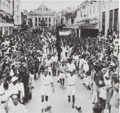 Nhân dân Hà Nội đón quân Đồng minh vào giải giáp quân Nhật ở phố Tràng Tiền, tháng 8 năm 1945.