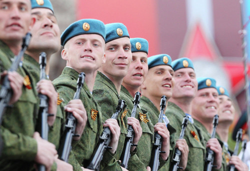Một toán binh sỹ đại diện cho Lực lượng Nhảy dù Nga diễu hành trên Quảng trường Đỏ trong ngày Chiến thắng 9/5.