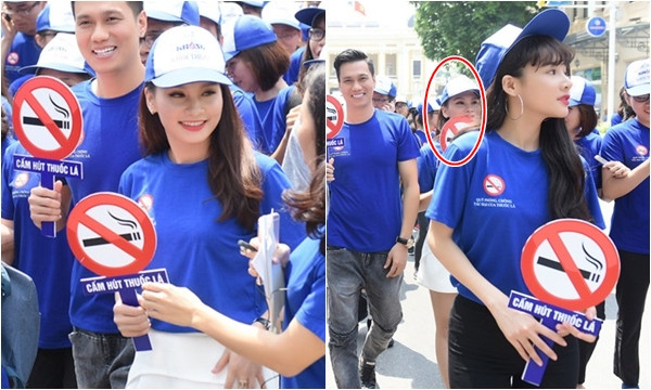 Tham gia Lễ mít tinh hưởng ứng Ngày Thế giới không thuốc lá vào cuối tháng 5 vừa qua, Bảo Thanh khoác tay Việt Anh đi bộ trên phố.