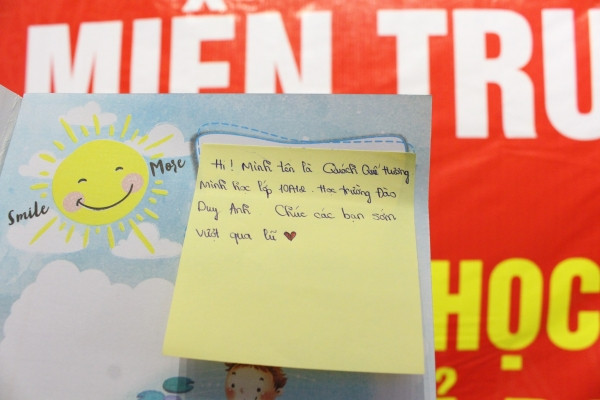 Bạn Quách Quế Hương, học sinh trường Đào Duy Anh (TP.HCM) gửi lời động viên cùng món quà nhỏ tới bạn bè miền Trung.