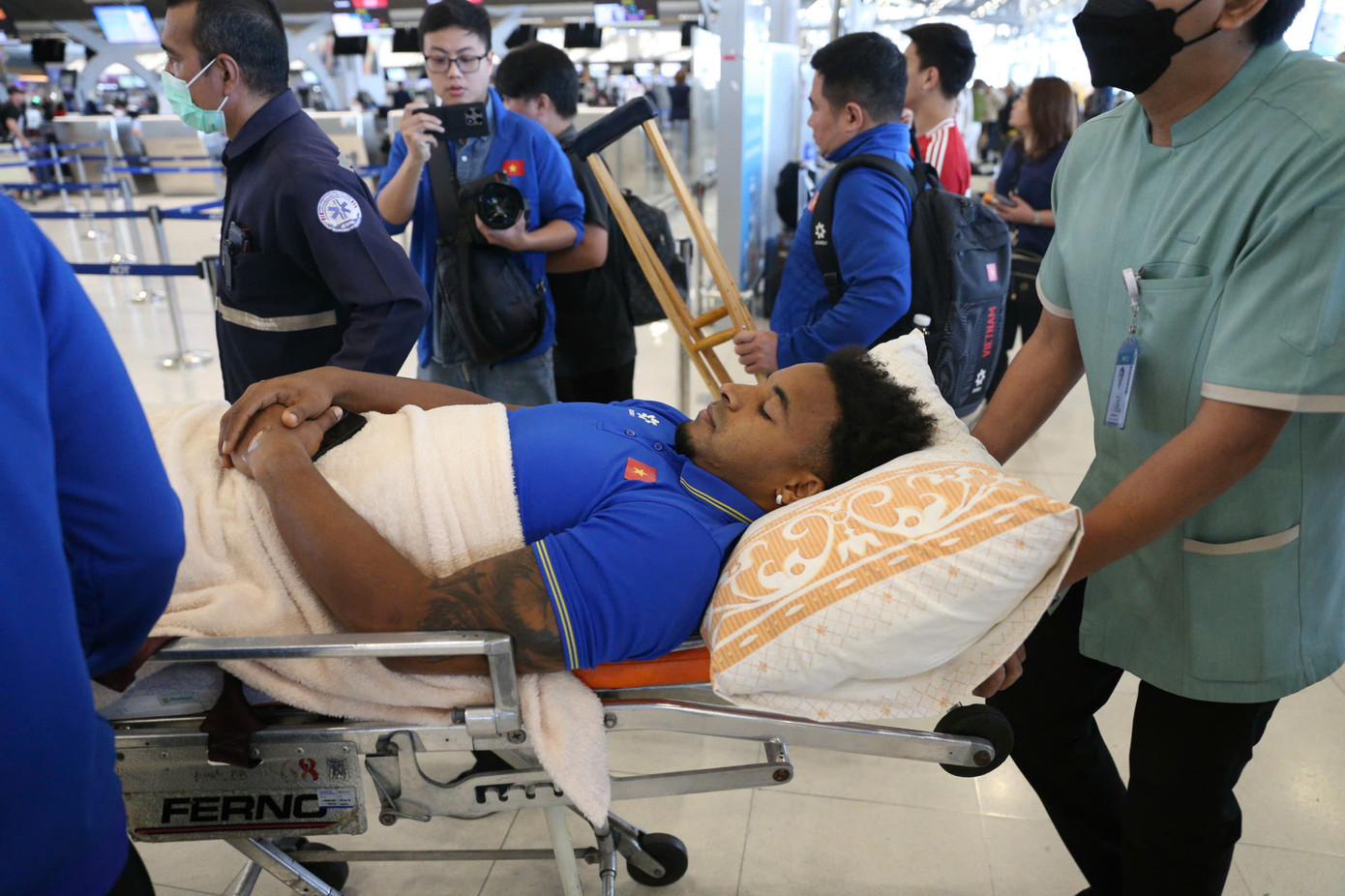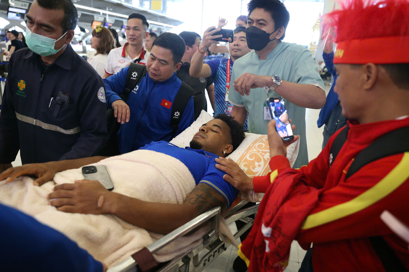 | Anh được người hâm mộ vây kín thăm hỏi và động viên sau khi dính chấn thương nặng trong trận chung kết lượt về ASEAN Cup 2024. |