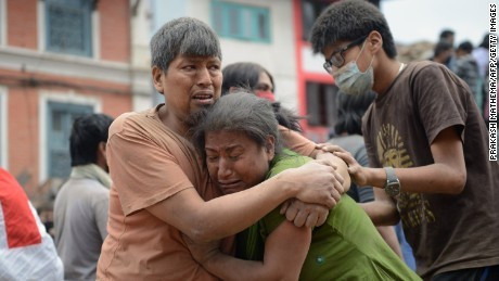 Những người sống sót sau trận động đất an ủi nhau tại ngôi đền cổ Basantapur Durbar ở thủ đô Kathmandu, hôm 25/4. Ảnh: CNN