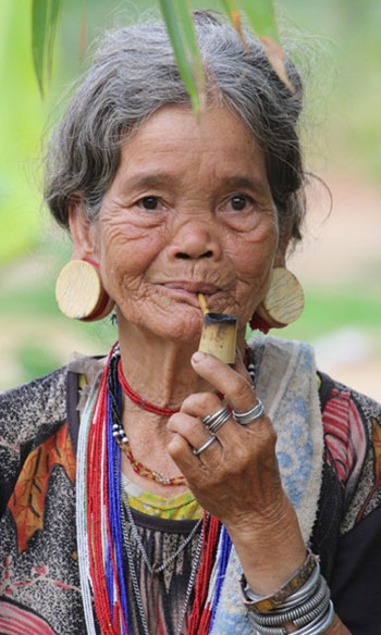 Bà cụ cười hiền khô, cái tai bà bị căng suốt từ lúc mới 5 tuổi đầu (lễ xâu tai) rồi đeo đủ thứ vòng vèo trang sức nặng trĩu, đến nay đã ngoại tám chục tuổi giời, đôi vành tai thõng chảy đó đã rộng đến mức đút vừa cả cái cốc uống bia hơi. Theo thói quen, vành tai người phụ nữ giàu thì được nong vào đó một miếng ngà voi tròn, to làm vật trang trí. Bà Grâu cũng từng đeo miếng ngà voi, nhưng vì nghèo, bà đã bán nốt cả cái miếng ngà từng gắn bó với mình hơn 70 năm ròng để lấy tiền đong gạo.
