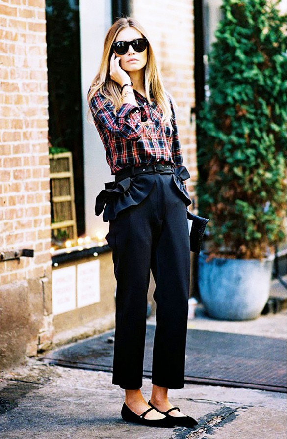 Sơ mi kẻ caro không bao giờ lạc mốt, kết hợp với quần thụng đính bèo rất đẹp.