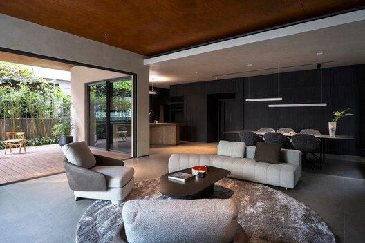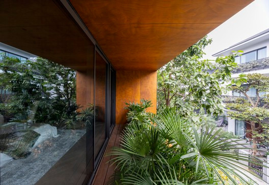 Ở tầng một các không gian chung như phòng khách, phòng ăn, bếp, phòng sinh hoạt bán ngoài trời được bao bọc bởi sân trước, các lối đi và khoảng cây xanh. Tại tầng 2, phòng ngủ master của cha mẹ và phòng ngủ cho con nhỏ cùng các khu vệ sinh được kết nối với một sân vườn có nhiều cây xanh đa tầng tán.