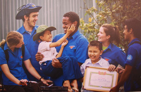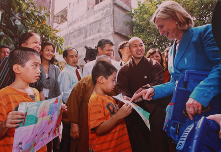 Ngoại trưởng Mỹ Hillary Clinton tặng quà cho trẻ em mồ côi nhiễm HIV tại chùa Ngọc Lâm, Long Biên – Hà Nội (7/2010) – (Tác giả: Trần Việt Dũng)