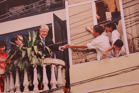 Một trang sử mới bắt đầu! Tổng thống Mỹ Bill Clinton bắt tay một nhóm trẻ em Việt Nam từ ban công một tòa nhà đối diện Văn Miếu – Quốc Tử Giám – ngày 17/11/2000) – (Tác giả: Trần Việt Dũng)