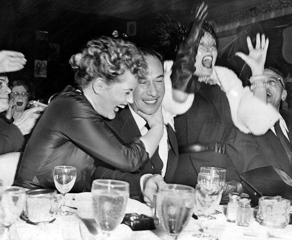 Judy Holliday (trái) ôm José Ferrer (giữa) trong niềm vui sướng khi Ferrer nhận giải Nam chính xuất sắc nhất cho bộ phim Cyrano de Bergerac tại lễ trao giải Oscar năm 1950. Judy Holliday cũng được vinh danh là Nữ diễn viên chính xuất sắc nhất năm. Gloria Swanson (phải), người được đề cử Nữ diễn viên chính xuất sắc nhất, cũng nhảy lên sung sướng chia vui cho thành công của Ferrer.