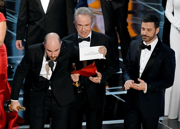 Sự cố trao nhầm giải "Phim hay nhất" cho La La Land trong khi người chiến thắng thực sự là ekip phim Moonlight, tại lễ trao giải Oscar lần thứ 89, ngày 26/2/2017.