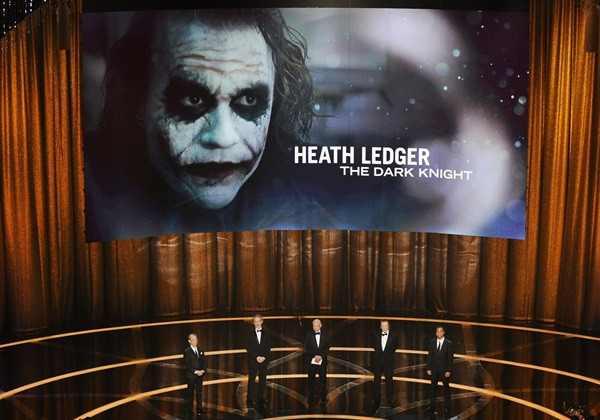 (Từ trái qua) Joel Grey, Kevin Kline, Alan Arkin, Christopher Walken và Cuba Gooding Jr. lên công bố giải Nam diễn viên phụ xuất sắc nhất cho Heath Ledger với bộ phim The Dark Knight, trong lễ trao giải Oscar lần thứ 81 ngày 22/2/2009. Heath Ledger đã qua đời năm 2008 và cha mẹ, chị gái của nam diễn viên lên nhận giải thay anh.