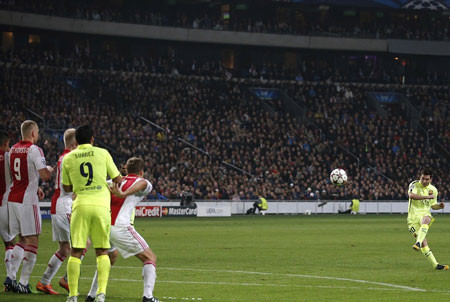 Messi trong pha sút phạt nguy bóng đi sạt xà ngang khung thành Ajax