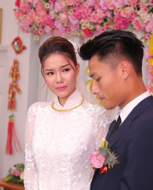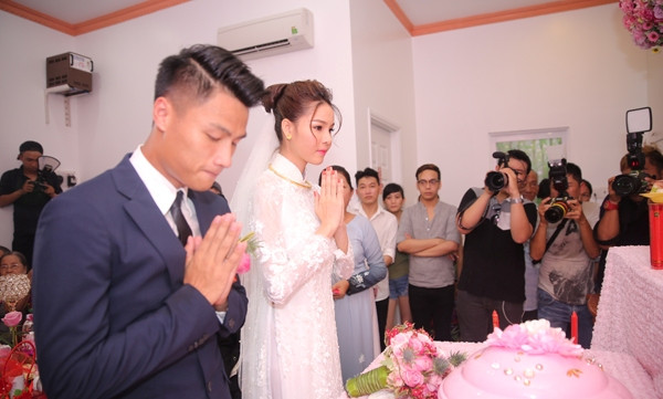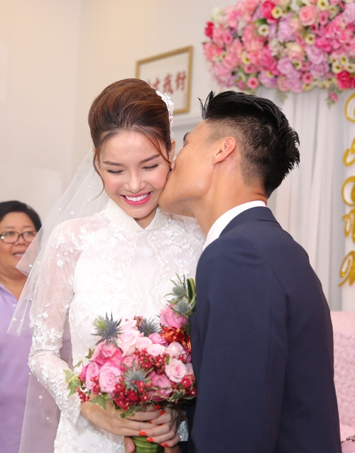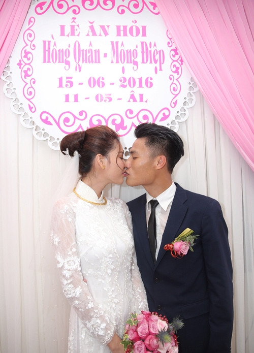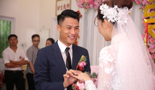Chàng tiền đạo 9x hôn tay cô dau sau khi đã trao nhẫn.