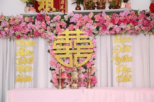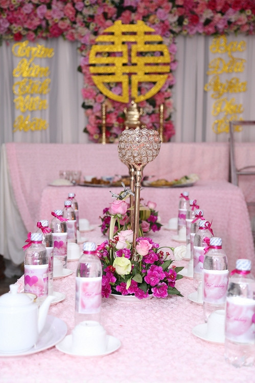 Không gian bài trí ở nhà gái với hai tone màu chủ đạo là hồng và trắng.