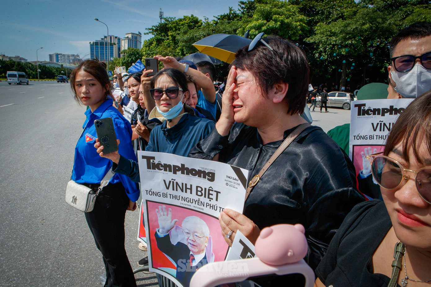 | Người dân mang theo hoa cúc, di ảnh của Tổng Bí thư. |
