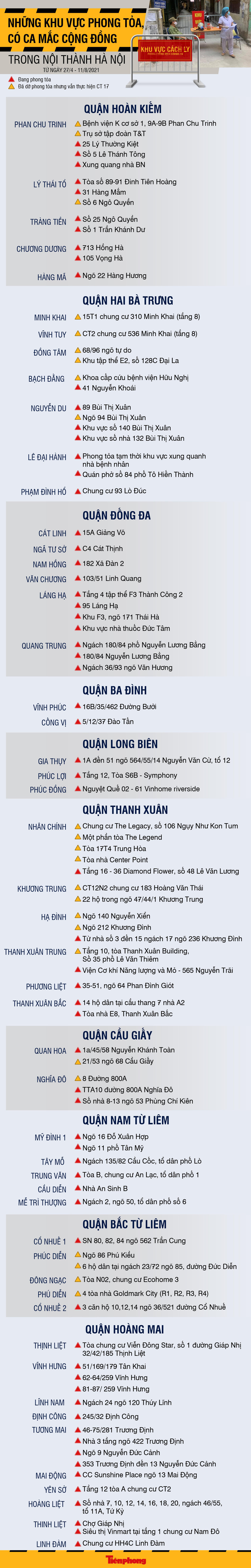 TPO - Chi tiết khu vực phong tỏa và địa bàn ghi nhận ca mắc COVID-19 cộng đồng trong nội thành Hà Nội từ ngày 27/4 đến 11/8/2021.
