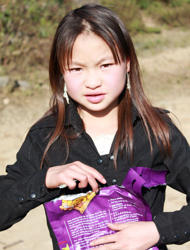 Em bé dân tộc ở Sa Pa thích thú khi nhận được quà từ khách. Ảnh: Anh Phương.