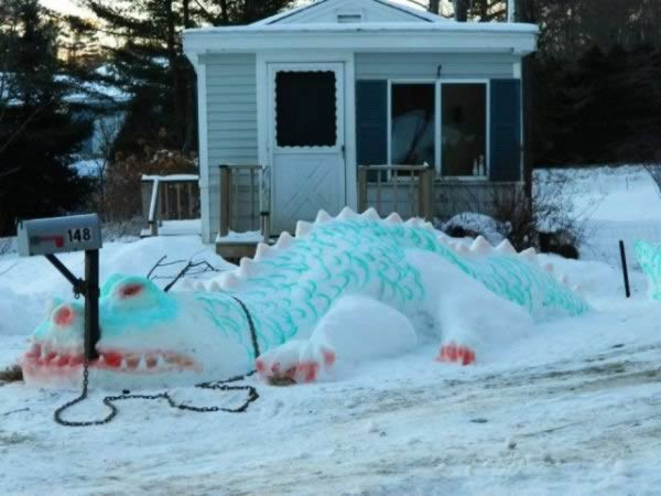 Con cá sấu bằng tuyết được trang trí thêm màu sắc sinh động