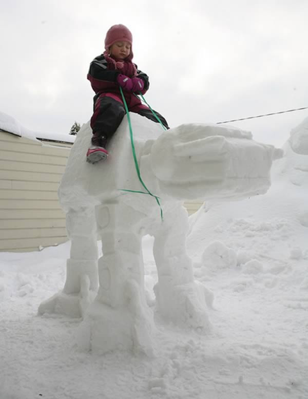 Cậu bé vui đùa trên tác phẩm bằng tuyết.
