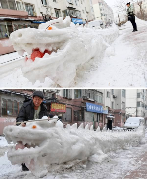 Những người dân tại Jilin, Trung Quốc đã dành hơn 10 ngày để hoàn thành con rồng tuyết dài 9m.