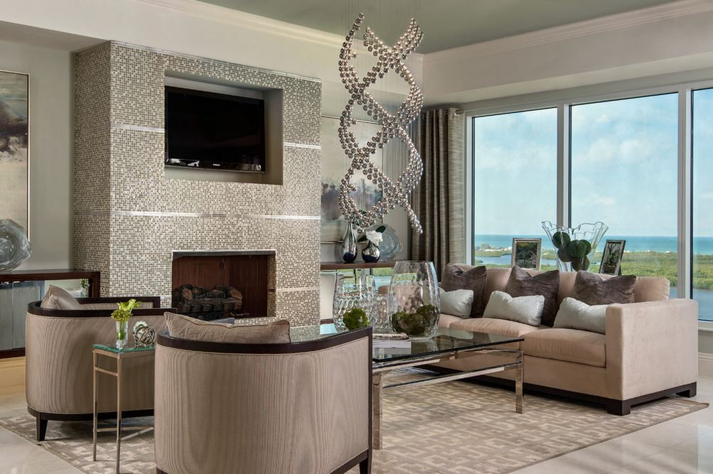 Phòng khách được trang trí nhẹ nhàng nhưng mang tới vẻ đẹp không giới hạn, nhờ sự kết hợp của thủy tinh, kim loại trên bức tường mang tới sự hài hòa.