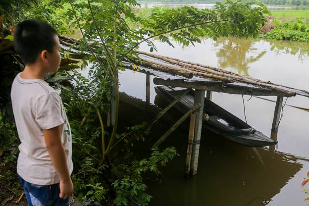 Chiếc thuyền người phi công thường đi đổ dớn, thăm lưới cá nằm yên một góc. "Khoảng hai tháng con về thăm nội một lần. Mỗi khi về nội đều dẫn con ra thuyền chơi rồi ra ao bắt cá nấu canh chua", bé Phúc (cháu nội ông Bảy) nói.
