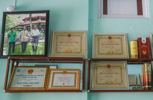 Dãy bằng khen trong đó có danh hiệu "Anh hùng lực lượng vũ trang nhân dân Việt Nam" cùng ảnh đời thường của Nguyễn Văn Bảy được đóng khung, lưu giữ cẩn thận.