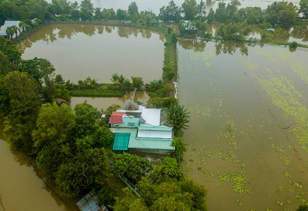 Căn nhà của ông Bảy nhìn từ trên cao giữa bốn bề đồng nước. Hơn hai năm nay, ngôi nhà mới được xây kiên cố. Nguyễn Văn Bảy là một trong 19 phi công Việt Nam đạt đẳng cấp ACE - danh hiệu có từ chiến tranh thế giới thứ hai dành cho những phi công lái máy bay quân sự có số lần bắn hạ máy bay đối phương đạt con số từ 5 trở lên.