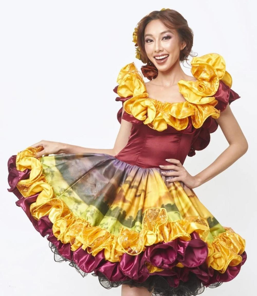 Trong chuyến công tác tới Nam Mỹ, ghé thăm Colombia, Hoa hậu Thùy Tiên mặc 3 bộ trang phục truyền thống của đất nước này có tên lần lượt là San Juanero, Llanero và Cumbia với màu sắc vô cùng sặc sỡ. Colombia có khá nhiều kiểu trang phục dân tộc nhưng đây là 3 trong số những mẫu trang phục phổ biến nhất.
