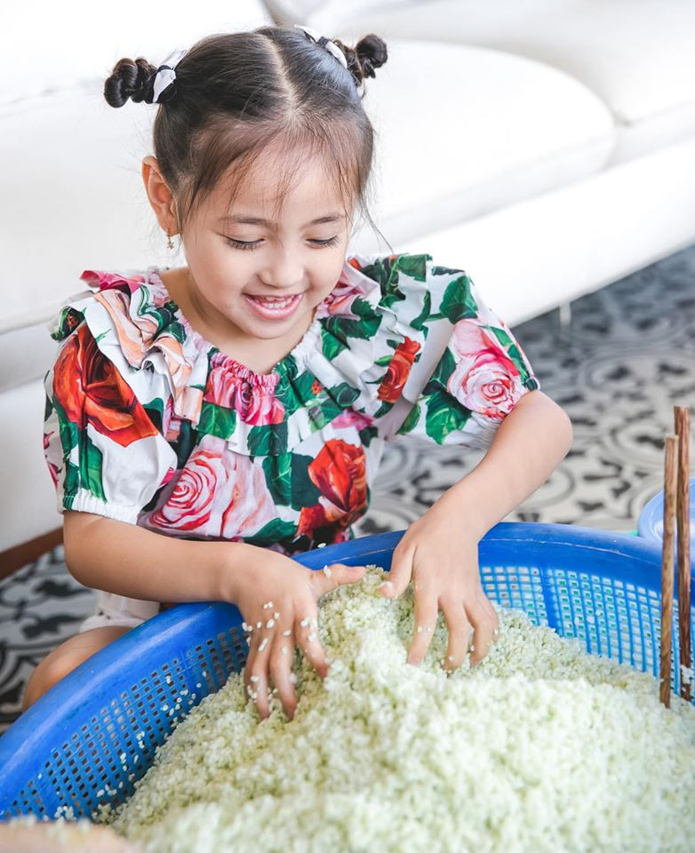 Trước Tết, khi gói bánh chưng, Hà Kiều Anh và con gái tiếp tục diện đồ đôi ấn tượng.
