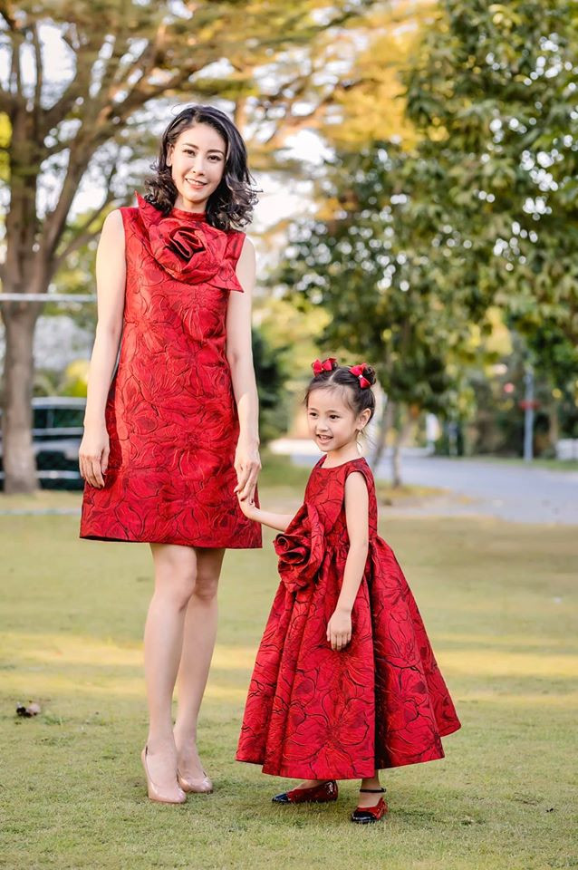 Trong khi mẹ Hà Kiều Anh diện váy dáng xuông hoạ tiết hoa màu đỏ rực thì bé Viann cũng diện kiểu váy xoè cùng hoạ tiết với điểm nhấn là chiếc nơ ở eo.