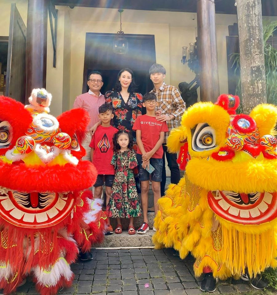 Cô công chúa nhỏ luôn nổi bật khi chụp ảnh cùng đại gia đình nhờ gu thời trang ấn tượng do được mẹ định hình phong cách. Trong không khí Tết, Hà Kiều Anh và con gái chọn mặc váy tông màu vàng thêu hoạ tiết hoa cỏ trước ngực vô cùng thanh lịch. Nếu mẹ Hà Kiều Anh diện kiểu váy xuông đơn giản thì Viann lại điệu đà với kiểu váy xoè công chúa.