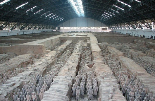 2. Đội quân đất nung: Đây là lăng mộ của Tần Thủy Hoàng, Hoàng đế đầu tiên của triều đại nhà Tần, người đã đánh bại tất cả các nước khác và thống nhất Trung Quốc. Ngôi mộ của Hoàng đế không được khai quật nhưng khu vực quân đội đất nung được chôn gần đó đã trở thành điểm đến hàng đầu tại Trung Quốc. Người ta ước tính trong ba hố chứa có hơn 8.000 binh sĩ, 130 xe ngựa vơi 520 con ngựa và 150 kỵ binh ngựa, phần lớn trong số đó vẫn đang bị chôn vùi. Mỗi chiến binh mang một khuôn mặt và người ta suy đoán đó là dựa vào những khuôn mặt của người còn sống.