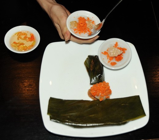Bánh nậm cũng được làm từ bột gạo. Bột bánh được dát mỏng trên miếng là chuối, rồi xếp lại theo hình chữ nhật vuông vức. Phần nhân bánh là một ít tôm xào chín với gia vị. Món bánh này hút hồn du khách với hương thơm của bánh, mặn mà của tôm, của nước mắm cùng cảm giác tan trên đầu lưỡi.