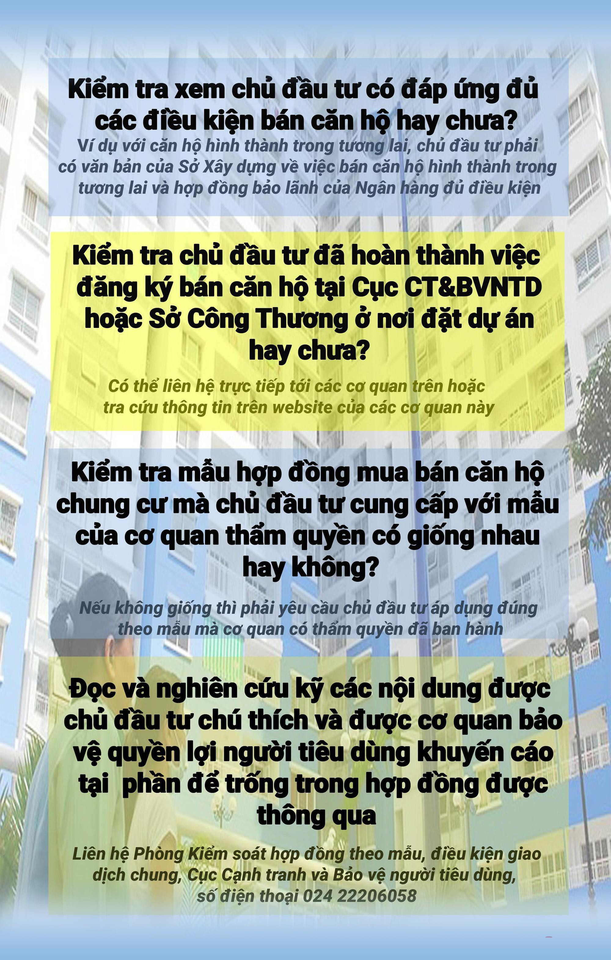 TPO - Cục Cạnh tranh và Bảo vệ người tiêu dùng (CT&BVNTD), Bộ Công Thương vừa thông báo một số lưu ý đối với người tiêu dùng khi ký kết hợp đồng theo mẫu trong lĩnh vực mua bán căn hộ chung cư để tránh gặp phải những rủi ro phát sinh.