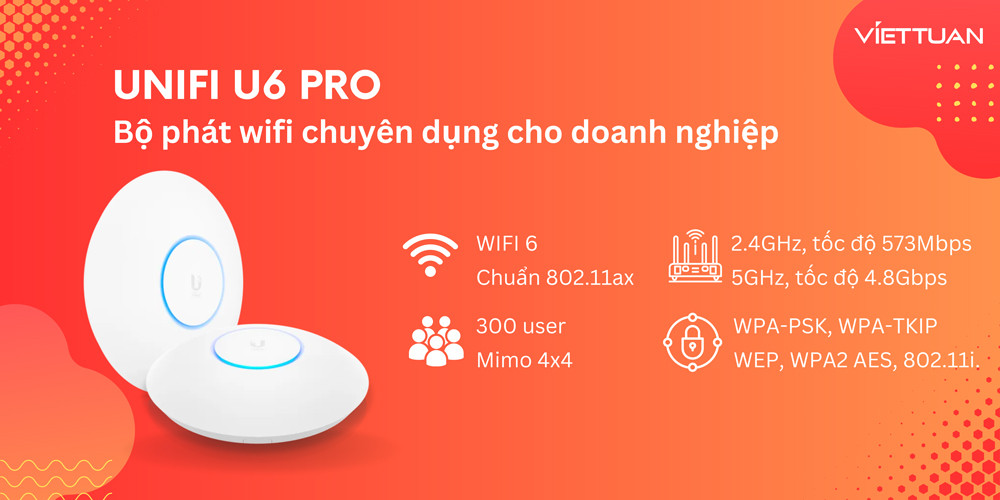 Unifi U6-Pro sẽ là thiết bị Wifi mà Việt Tuấn muốn đề cập đối với phân khúc chuyên dụng cho doanh nghiệp. UniFi U6 Pro hiện đang là 1 trong các thiết bị wifi cao cấp đến từ thương hiệu thiết bị mạng Unifi, được các đối tác khách hàng của Việt Tuấn tin tưởng lựa chọn. Thiết bị sẽ hỗ trợ thiết lập 1 hệ thống mạng không dây hiệu năng cao tại các văn phòng doanh nghiệp, cửa hàng, khách sạn,...